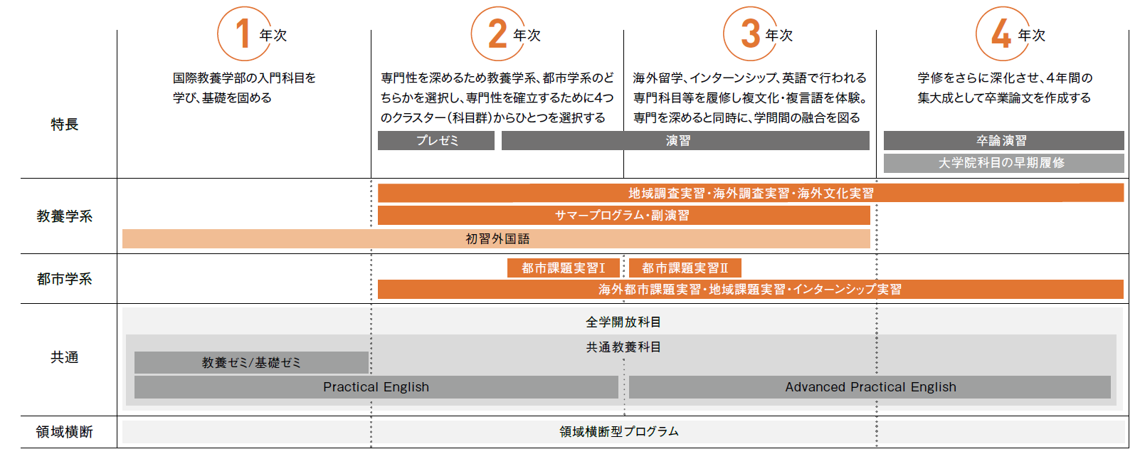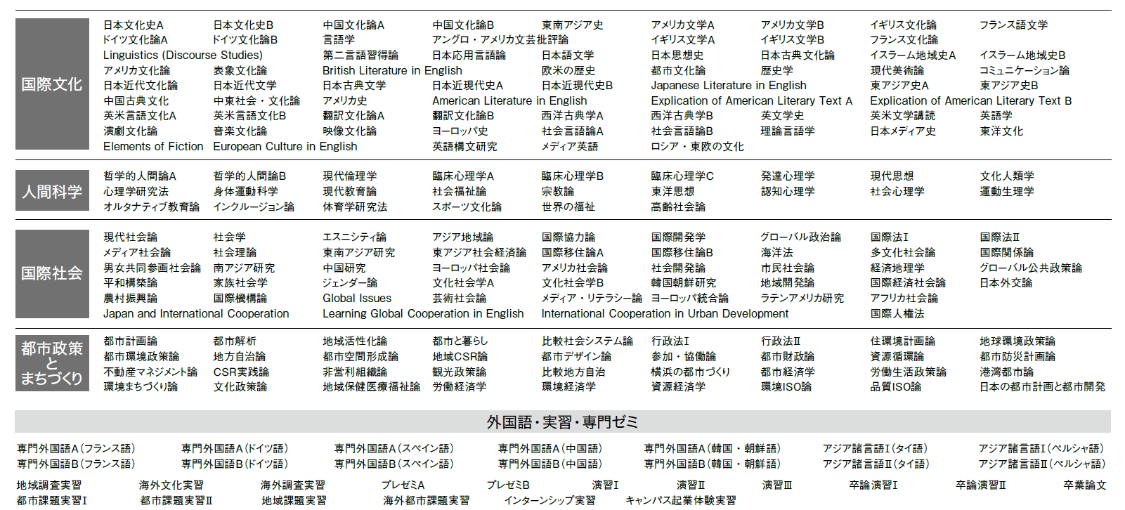 国際教養学部は、「教養学系」と「都市学系」という2つの学系を持ち、少人数で行われるゼミを中心にそれぞれの専門性を深めていきます。その専門性を確立するために4つのクラスター(科目群)を設けています。学生はその中から必ずひとつのクラスターを選択し、集中的に学ぶ「専門の軸」を持ちながら、関連する学問領域の科目まで融合的に学修することができます。<国際文化><人間科学><国際社会><都市政策とまちづくり>の4つのクラスターを専門の軸として、上記の専門科目における各カテゴリーから関連する科目を履修していきます。