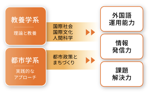 国際教養学部では、英語をはじめとする外国語の運用能力、文化的背景に基づいた多様性への理解、理論を実践に応用する能力、そして共感を獲得し課題を解決するためのコミュニケーション能力を身に付けます。また、確かな専門性に裏打ちされた論理的思考力を身に付ける「教養学系」と、世界と日本の都市や地域の課題に実践的に取り組む「都市学系」という2つの学系での学びを通して、真のグローバル人材を育てます。