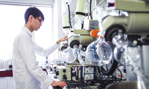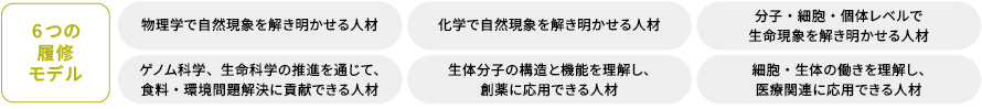 理学部では、すべての学生が物理学、化学、生物学、数学の基礎を一通り学んだ上で、物質科学、生命科学、あるいはこれらの融合領域分野へ進みます。高等学校で物理あるいは生物を履修していない学生に対して、1年次にリメディアル講座の授業を用意して います。6つの履修モデルに沿って、高度な専門的知識・技術を身に付けます。