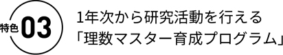 自然科学研究では実験に基づく研究が不可欠ですが、学生にとっての研究スタートは3年次後期であり、それまで待たなければなりません。本学理学部の特別プログラムである「理数マスター育成プログラム」では、プログラム参加学生は1年次から自主的に研究活動を行うことができます。そのための専用教室「理数マスター室」をいつでも使 用することができるように整備しました。学生自らが決めたテーマに従って、教員の個別指導のもとで研究を進め、その成果を学内外の発表会で発表します。