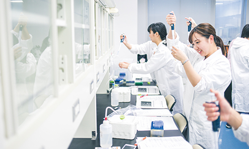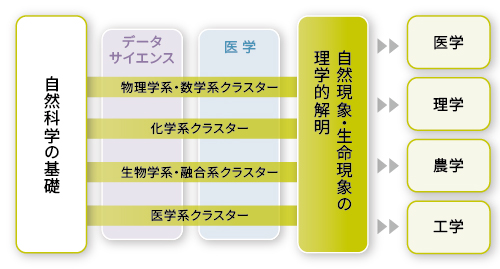 理学部では、自然科学の基礎を全般的に学ぶことで、物質科学の概念を踏まえて細胞・個体スケールの生命現象を捉えることができる人材、生命現象を原子・分子スケールで起こる物質科学として捉えることができる人材の育成を目指しています。そして、理 学的専門教養をもとに、医学・農学・工学等の連携研究にも積極的に挑戦できる人材を養成します。