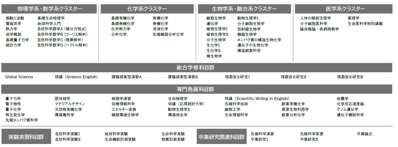 1年次には全員が物理学、化学、生物学の基礎実験を必修で学びます。それにより、理学全般の基礎的な知識や、必要とされる実験技術をしっかりと修得し、専門教育にスムーズに移行できる基礎力を養います。2年次以降はさまざまな専門領域から目的を持って学ぶため、6つの履修モデルを用意し、体系的に学修できるようになってい ます。さらに、各科目は学問領域ごとにグループ化された4つのクラスター(科目群)を置き、このうち2つを選択して学びます。理学部では3年次後期に研究室に配属され、専門領域を追求していきます。