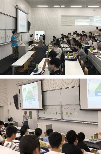 まずは講義の時間だよ。データサイエンスの歴史や応用例そしてデータサイエンス学部の概要について岩崎先生が説明してくれました。データサイエンスは世界中で広まりつつある注目の学問なんだって!