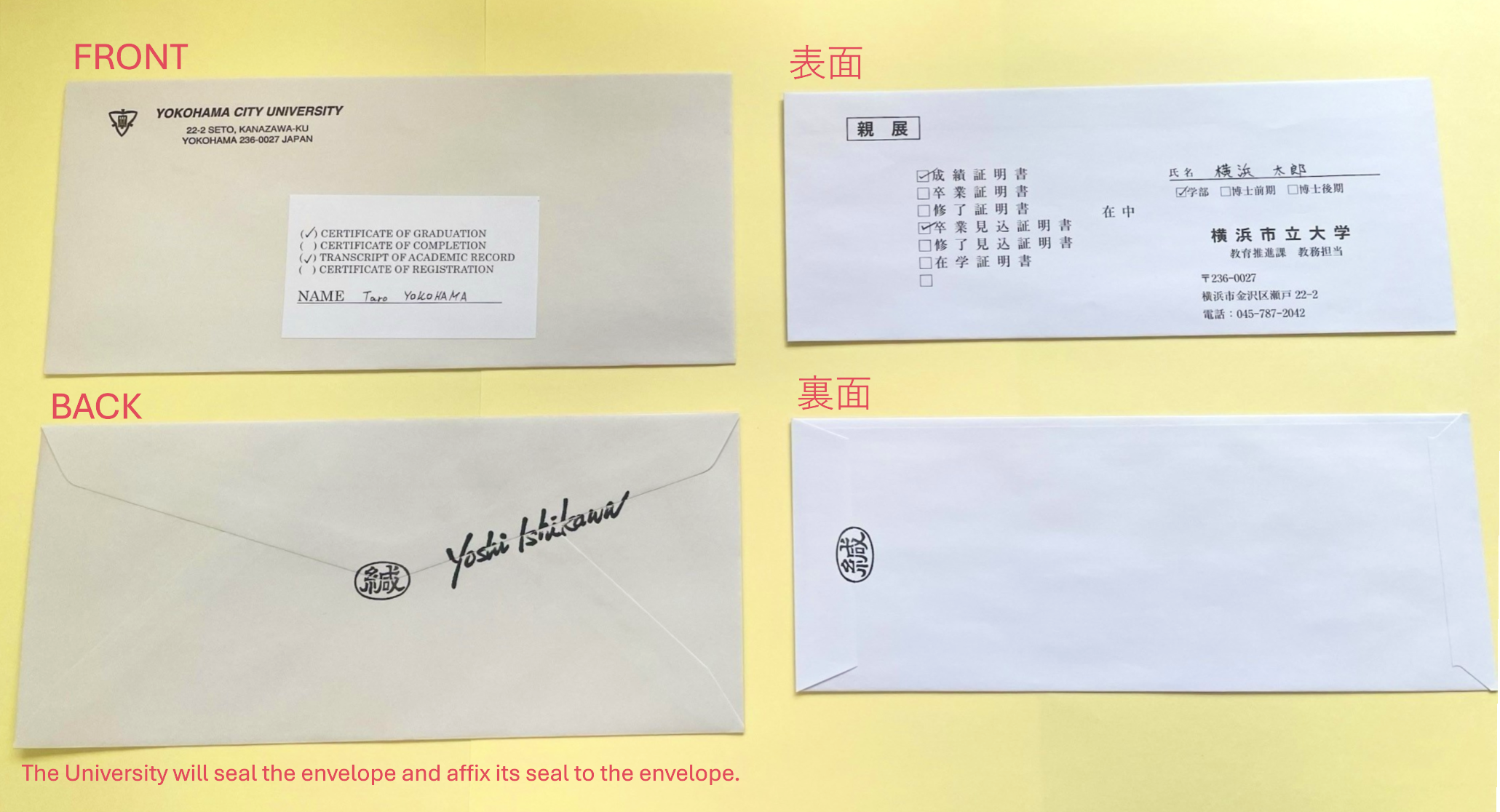 なお、成績証明書や卒業・修了(見込)証明書は、厳封されていないものは受付できませんので、ご注意ください。
