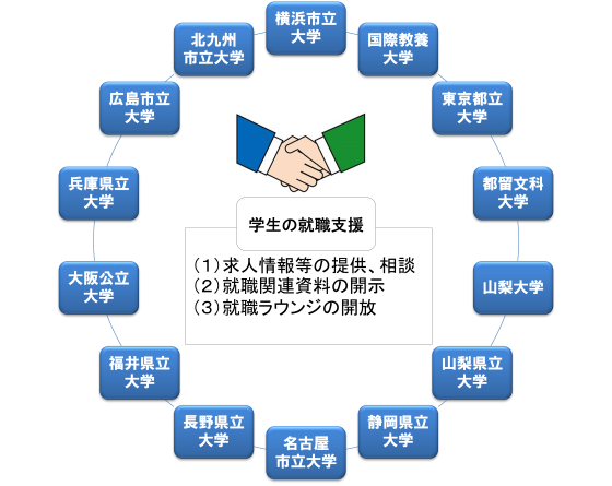 この制度は、2013年11月に本学と北九州市立大学が「就職支援パートナーシップ」を締結(覚書)してスタートし、2014年4月1日から全国10大学へ拡充しました。これにより本学の学生は、就職を希望する地域の 本制度参加10大学(以下「パートナー大学」という。)で下記のような支援が受けられるなど、学生に対してより質の高い就職支援の展開が可能となりました。