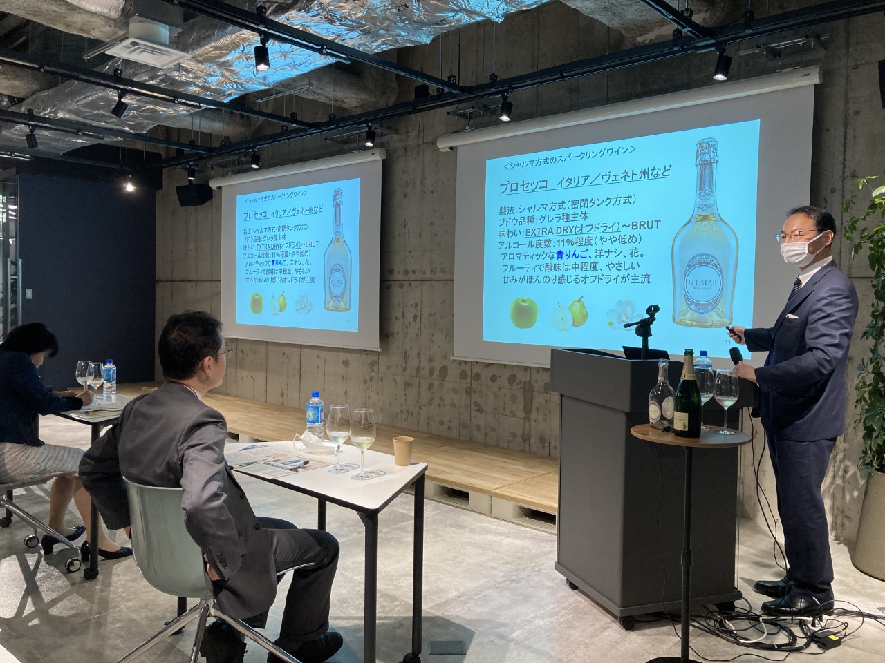 当日は24名の卒業生の方と本学から小山内理事長、大澤国際商学部長が出席し、第一部としてエノテカ株式会社執行役員で本学OBの 福北 耕一氏を講師にお迎えし、「ビジネスに役立つワインの知識」をテーマに、テイスティングを交えつつご講演いただきました。