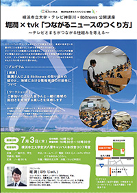 ジャーナリストの堀潤さんをお招きし、いままでのマスメディアが発信する情報とはまったく正反対の地域からハッスル情報の面白さをお話いただき、テレビ神奈川と取り組んでいる新しいニュースのかたちをみなさんとともに考えたいと思います。
