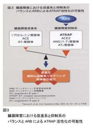 レニン-アンジオテンシン系はその生理活性物質アンジオテンシンIIが生体における主要な受容体であるAT1受容体に作用して下流の情報伝達系を活性化することにより、高血圧、心肥大、心不全、動脈硬化、腎障害などの心血管系疾患、あるいはインスリン抵抗性症候群であるメタボリック症候群の発症・進展に深くかかわっている。研究グループの田村准教授は米国ハーバード大学医学部内科学Victor J Dzau教授、および愛媛大学生医学部堀内正嗣教授らとの共同研究により単離同定したAT1 受容体C末端に特異的に結合する低分子蛋白(ATRAP, AT1 receptor-associated protein; J Biol Chem 1999)についての研究をおこなっており、ATRAPはAT1受容体情報伝達系の活性制御因子としてその病態生理学的意義が注目されている(表1).現在までにATRAPについて、心筋細胞において効率的に心肥大反応を抑制すること(文献1)、腎臓に広く分布しており塩分摂取量の変化などによってその発現が変化すること(文献2)、あるいは、アンジオテンシンII刺激によって誘発される血管の種々の動脈硬化反応がATRAPによって効率的に抑制されること(文献3)などをすでに国際誌に論文発表している。これらの研究成果から、ATRAPが心血管系細胞表面のAT1受容体を減少させることにより、すでに臨床応用されているAT1受容体拮抗薬とは異なる新しい分子機序によりAT1受容体を介する病的心血管系リモデリングやメタボリック症候群を抑制する可能性が示されている(図2)。そして、田村准教授らは、組織AT1受容体発現量/ATRAP発現量(両者の発現量比)= 組織局所でのAT1受容体情報伝達系活性度として相対的な組織レニン-アンジオテンシン系の新しいバロメ−タとして提唱しており、奔研究の研究成果により『組織ATRAP発現量 / AT1受容体発現量 の低下 → 組織局所でのATRAP発現低下によるAT1受容体情報伝達系活性の亢進 → 心血管系や腎における心血管病・メタボリック症候群の発症・進展』という新しい概念を臨床医学に導入できる可能性がある。研究では、本態性高血圧の病態モデル動物(高血圧自然発症ラット,SHR)を用いて、AT1受容体とその新規結合蛋白質ATRAPの発現調節および両者の発現量バランス制御についての解析をおこない、高血圧の進展にともない組織特異的なATRAPとAT1受容体との発現量のバランスが変化することや、降圧薬であるAT1受容体拮抗薬(ARB)投与することによりその発現のバランスが変化することを明らかにし、組織特異的なATRAPとAT1受容体との発現量のバランスの改善がARBの降圧を超えた多面的な作用のひとつである可能性を示した(図3)。なお、本研究成果は、一部本学の研究戦略プロジェクト研究費により行われた。