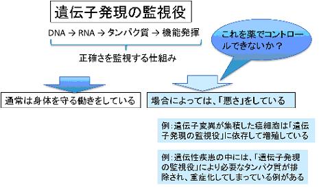 ゲノムDNAにコードされた遺伝情報は、RNAを通じてタンパク質に翻訳されます。最近の研究から、異常なタンパク質を作らせないための仕組みとして、DNAからタンパク質への一連の過程を監視する「遺伝子発現の監視役」があることが明らかとなりつつあります。