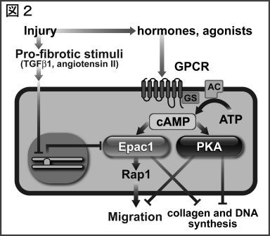 本学医学研究科循環制御医学の横山詩子助教らは本研究で、心臓の線維化抑制による慢性心不全治療の開発に興味を持ち、生体内の主要なセカンドメッセンジャーであるサイクリックAMP(cAMP)の新たな標的として発見されたEpac(Exchange Protein directly Activated by cAMP)の線維化抑制効果を明らかにしました。
