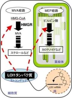 細胞質のMVA経路では、ステロールなどが、葉緑体のMEP経路ではカロテノイドなどが生合成される(黒太矢印)。核で転写されたLOI1遺伝子はタンパク質に翻訳された後にミトコンドリアに輸送される(黒細矢印)。ミトコンドリアで呼吸鎖複合体にかかわる遺伝子を転写後調節(RNA編集)することで細胞質のMVA経路と葉緑体のMEP経路の制御にかかわる(赤点線矢印)。