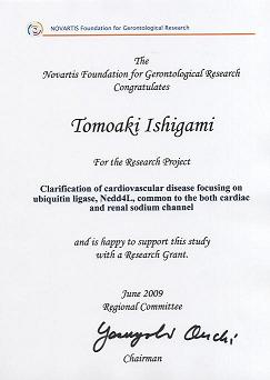 病態制御内科学/循環器・腎臓内科学の石上友章准教授が、社団法人日本老年医学会の公式助成事業である「ノバルティス老化および老年医学研究基金」の2009年度(第23回)研究助成の受賞者に決定しました。授賞式は、平成21年6月19日にパシフィコ横浜で開催された「第51回日本老年医学会学術集会総会」において行われました。