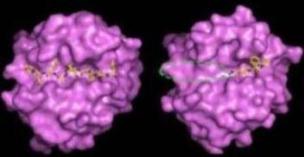 ●図2.APP-IP(左)とヒドロキサム酸系阻害剤(右)とのMMP複合様式の比較