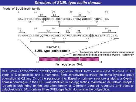 「SUEL型レクチンドメイン」 (IPR000922)は最初の構造決定以来20年を経て、ヒトやマウス脳の神経毒受容体、魚類卵レクチン、植物の糖分解酵素などの多くのタンパク質や遺伝子に見出され、2012年現在、ゲノムデータベースに登録されている数は1000種類以上にのぼりました(http://www.ebi.ac.uk/interpro/IEntry?ac=IPR000922)。