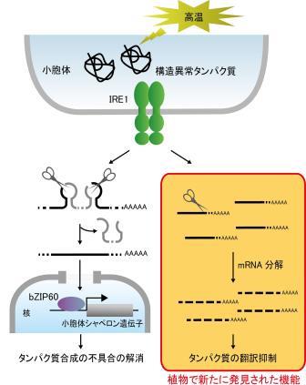 同グループはモデル植物シロイヌナズナからIRE1を発見し、IRE1が細胞質スプライシング(注4)を介して小胞体ストレス応答を促す転写因子を活性化させることを報告してきましたが、今回の研究で、IRE1が高温などの環境ストレスに速やかに応答し、小胞体で合成されるタンパク質のmRNA(全遺伝子の約3分の1に相当)の多くを分解することを発見しました。この働きはmRNAを分解することで、ストレスによるタンパク質合成の不具合を未然に防ぐ仕組みであると考えられます。