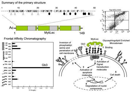 レクチンの糖鎖結合性を網羅的に解析し、O157細菌が分泌するベロ毒素が細胞に結合する際の足場となるグロボトリオース(Gb3:Gal1-4Gal1-4Glc)糖鎖に結合することが判明したため、Gb3を多く発現するヒトリンパ腫Raji細胞にMytiLecを加えると、後期アポトーシス(プログラムされた細胞死)が誘導された。これらの結果から、MytiLecは、スフィンゴ糖脂質を介す細胞の情報伝達を研究するための優れた糖鎖研究分子として活用され得ることが期待されました。