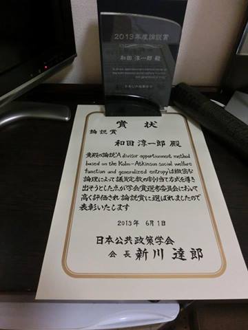 国際総合科学群の和田淳一郎教授が、一昨年の日本選挙学会賞に引き続き、Mathematical Social Sciences 63巻第3号に掲載された論文、”A divisor apportionment method based on the Kolm-Atkinson social welfare function and generalized entropy”で、公共政策学会学会賞を受賞しました。Nash Social Welfare Functionに依拠した分離可能な不平等指数により、議員配分が引き起こす不平等と区割りが引き起こす不平等を明確にし、国際比較を行ってJournal of Theoretical Politicsに掲載した論文と、国内の歴史的変遷を追って『選挙研究』に掲載した論文を、Atkinson Social Welfare Function (Generalized Entropy) に拡張し、その整数値最適解を求めた論文です。