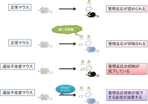 その中の一つとして、遺伝子改変マウスが「驚愕反応抑制の低下」という症状を示すことが分かりました(図1)。「驚愕応答抑制」とは、突然に強い音刺激を動物に与えることで生じる驚きの度合い(驚愕反応)が、その強い刺激の直前に比較的弱い刺激を与えることで抑制される現象のことです(図1)。一部の統合失調症患者さんでは、私達が調べた遺伝子改変マウスと同様に、「驚愕応答抑制の低下」が認められます。また、統合失調症の治療薬として用いられている「クロルプロマジン」を投与したところ、遺伝子改変マウスの症状が改善したことから、「クリンプ1」を発現できない遺伝子改変マウスが、統合失調症患者さんに類似した症状を示すことが分かりました。