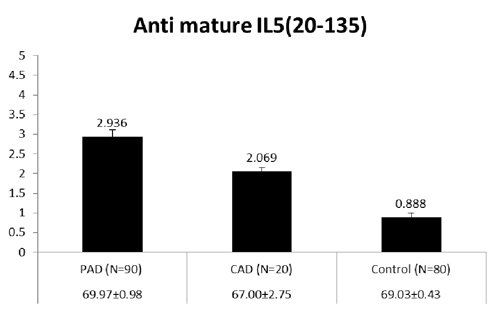 閉塞性動脈硬化症(末梢動脈疾患 PAD)患者90名、冠状動脈硬化症(CAD)患者20名および、年齢をマッチさせた健常成人80名の個別血清に対して、抗分泌型IL5抗体価を測定したところ、健常成人に比較して、PAD・CAD群で有意に抗体価が高値を示すことが明らかになりました。<図1>