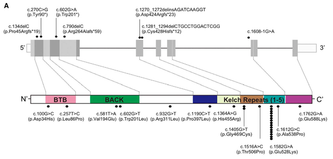 図A:国際共同研究で同定されたKLHL40 遺伝子の全変異とアミノ酸の変化。1582番目の塩基置換を起こす遺伝子変異(c.1582G>A)は日本人で高頻度に同定された。