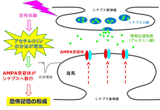 様々な脳領域の中でも特に海馬は記憶の中枢として長い間大きな注目を浴びてきました。以前、本研究グループはトラウマ記憶が形成される際に、AMPA受容体のシナプス移行が海馬において起こり、かつトラウマ記憶形成に必要な現象である、ということを発見しました(Mitsushima et al. PNAS)。そして今回、海馬に依存した恐怖記憶が心に刻まれるときに起きるAMPA受容体のシナプス移行がアセチルコリンという物質の増加により仲介されているということを明らかにしました。