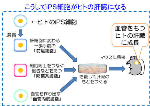 横浜市立大学 大学院医学研究科 臓器再生医学 谷口 英樹教授、武部 貴則助手らの研究グループは、世界で初めてヒトiPS細胞から血管構造を持つ機能的なヒト臓器を創り出すことに成功しました。研究グループは、最終的に臓器を形成させるための第一段階として、まず臓器の原基(臓器の種)が胎内で形成される過程を模倣する新規の細胞培養操作技術を開発しました。この特殊な培養方法により、試験管内においてヒトiPS細胞から立体的な肝臓の原基(肝臓の種、肝芽)が自律的に誘導できること、さらにこのヒト肝臓の原基を生体内へ移植するとヒト血管網を持つ機能的な肝臓へと成長し、最終的に治療効果が発揮されることを明らかにしました。