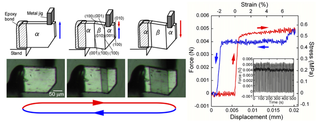 テレフタラミド結晶の超弾性(可逆的変態(左)と機械的負荷-変形量サイクル(右))