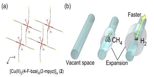 また、別の新規単結晶膜 [Cu(II)2(4-F-bza)4(2-mpyz)]n (4-F-bza = -fluorobenzoate; 2-mpyz = 2-methylpyrazine) (2) を用いたガス透過特性の解析から、ガス分子が結晶内部の細孔を拡張させながら拡散する機構を実験的に明らかにしました。この細孔拡張効果は、水素でもっとも大きく、水素ガスの精製材料設計に新たな指針を与えるものです。(図2)