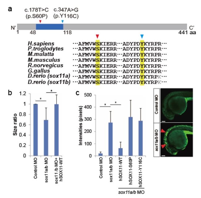 (a)CSS 2例に認められたSOX11の新生突然変異。両変異共に哺乳類からゼブラフィッシュまで保存されたアミノ酸の変化をもたらす変異であった。