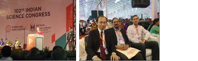 インド科学会議 (Indian Science Congress)は、インドで100年以上開催されてきた、政府と同科学技術・地球科学省科学技術局 が主催する国家最大の科学者会議です。第102回インド科学会議 は、横浜の姉妹都市ムンバイ にあり世界最大級の学生数を擁する国立ムンバイ大学で行われ、宇宙開発、ナノテクノロジー、情報、環境、医科学などの分野を研究する200名の講演者と2万名の参加者を迎えて開催されました。