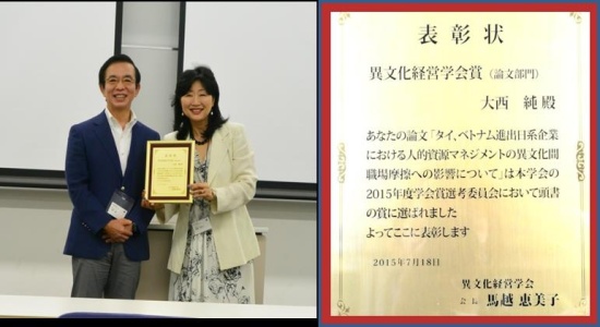 学術院国際総合科学群の大西純教授が、論文『タイ、ベトナム進出日系企業における人的資源マネジメントの異文化間職場摩擦への影響について』で第3回異文化経営学会 学会賞を受賞しました。異文化経営学会は、様々な国籍や言語や文化的背景の人々が織り成す「異文化経営」の事例研究を系統的に行い、経験知を形式知に転換することで得られた知識や知恵を、後世に継承することを使命として2003年に設立されました。異文化経営研究会は、その名が示すごとく、国籍、ジェンダー、年齢等の属性を超えた研究会であり、多様性が生み出すシナジー効果をねらって3ヶ月ごとに研究会を行ってきており既に30回を越えています。また当初関東地区が中心であった活動も、関西、九州、中部、北陸各地区に支部学会が設立され、各地域で活発に研究発表が行われています。今回大西教授が受賞された第3回学会賞はこれらの各学会支部から発表された2014年度の論文のうち最も優れたと評価されたものに与えられたものです。