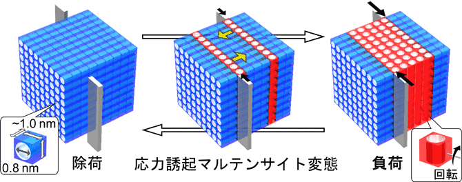 応力負荷/除荷による構造転移(青→赤/赤→青)で細孔方位が変換する様子