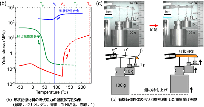 テトラ-n-ブチルホスホニウムテトラフェニルボレートの分子性イオン結晶(1)を合成し、合金様の形状記憶効果の発現を実験的に確認しました。約123℃に相転移温度(As)を持つ本有機結晶は、高温相で有機超弾性体に転移します。転移温度以下の温度領域で機械的負荷によって永久歪を持つ双晶変態を生じさせ、加熱により相転移温度を越えると超弾性により形状回復します(図2(a))。また、形状回復力である逆変態応力は加熱により増加します(図2(b)の1:赤線)。これは、温度によって弾性が増大する有機弾性材料を可能とする熱特性です。塑性変態および擬弾性変態に必要な降伏応力を形状記憶合金(図2(b):青線)と形状記憶高分子(図2(b):緑線)と比較すると、本有機結晶は形状記憶高分子より軟らかく変形し、加熱によって大きな形状回復力を発現するのがわかります。転移温度近傍で形状回復力は鋭く立ち上がるため、変形に要する仕事に対して100倍以上の仕事を狭い温度上昇幅で出力できます。(図2(b)の1:赤線)これは熱サイクル機械の動力として望ましい特性です。転移温度からわずか10℃の加熱で発揮される1MPaの形状回復力は、断面積1cm2(成人の指ぐらいの太さ)の結晶が10kgの錘を重力に逆らって持ち上げる力に相当します。そこで、0.18cm2の断面積を持つ長さ3.8cmの結晶を用いて重量挙げのデモンストレーションを行い、結晶の自重(0.6g)に対して約170倍の質量である100gの分銅を持ち上げるのを確認しました(図2(c))。