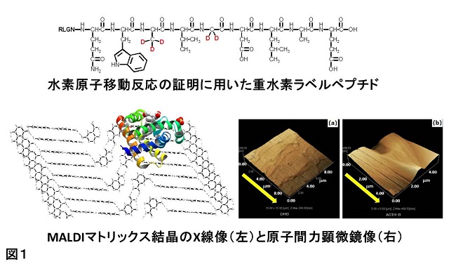 本研究は、マトリックス支援レーザー脱離イオン化質量分析(MALDI MS)によるタンパク質のアミノ酸配列解析の基礎となる分解反応の機構を解明し、モデル化したものです。タンパク質は、-CH(Xn)-CO-NH-CH(Xn+1)-の繰り返し構造でできており、側鎖Xnをもつアミノ酸が数100結合してできています。このアミノ酸の配列順序は最も重要で基本的な構造情報ですが、多数のアミノ酸配列を迅速に決定するのは技術的に難しく、1995年にMALDI MSによって配列解析を可能にする現象であるインソース分解(In-source decay, ISD)が発見されました。その反応機構は未解明でしたが、高山教授は2001年に、マトリックスのX線結晶構造解析データと原子間力顕微鏡像、および重水素化ペプチドを用い(図1)、紫外レーザー光を吸収するマトリックス結晶表面とタンパク質主鎖の水素結合を仮定することにより、分子間水素移動反応の機構を発表しました(図2)。それによれば、紫外レーザー光を吸収した安息香酸系のマトリックス結晶表面からは多量の水素原子が発生し、その際、結晶表面に載せたタンパク質の主鎖上のカルボニル酸素に特異的に結合し、タンパク質ラジカルが生成します(図3 中間)。タンパク質ラジカルは不安定であり、主鎖上のNH-CH(Xn)結合だけが特異的に切断し、その分解物であるc-ionを質量分析計で測るとタンパク質のアミノ酸配列が50残基以上も決定できます。この研究は、特に多くの海外研究者に取り上げられ、2007年には“Takayama’s Model”と名付けられ、現在ではイノベーションシステム整備事業で応用展開することで、さらなる成果として、翻訳後修飾タンパク質のアミノ酸配列解析、翻訳後修飾部位解析、柔軟性アミノ酸予測解析にも利用できるモデルであることが分かっています。