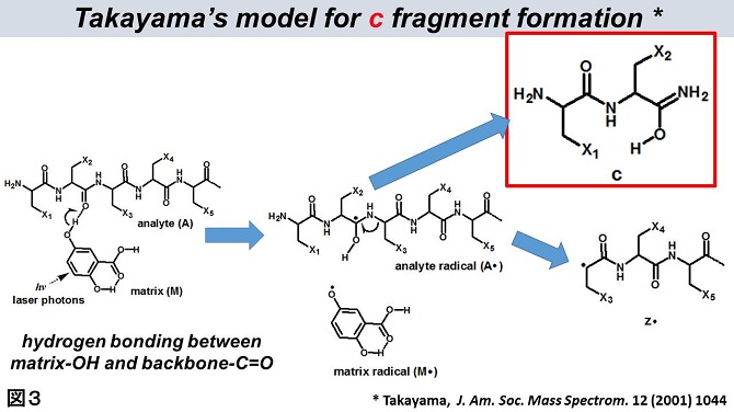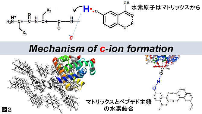 図1と図2より、タンパク質主鎖の N-Cα 結合が特異的かつ迅速(数十ns以内)に切断して cイオンが生成する過程を説明できる。結晶状態で予め水素結合を形成しているところに紫外レーザー光を照射し(左)、水素原子が効率的にカルボニル酸素に移動し不対電子をもったタンパク質ラジカルが生成(中間)。片矢印で示したラジカル開裂反応によって二つの分解物 c と z. が生成、これらをイオン化することで質量分析装置によって検出するとアミノ酸配列情報が得られる。