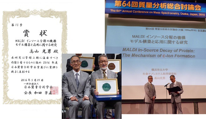 第64回質量分析総合討論会において、学会賞(MSSJ Award for Distinguished Contribution in MS)を受賞しました。日本質量分析学会(1953年発足)主催の上記年会が2016年5月18-20日、大阪・ホテル阪急エキスポパークで開催され、5月19日16:50より表彰式と受賞講演が行われました(写真1)。本学会賞は、質量分析学の発展に関し顕著な功績のあったものに授与され、 今回の受賞は15人目。受賞題目は、「MALDIインソース分解の機構 モデル構築と応用に関する研究」で、主要対象論文は以下の単著原著論文です。 M. Takayama, N-Cα bond cleavage of the peptide backbone via hydrogen abstraction, J. Am. Soc. Mass Spectrom., 12, 1044-1049 (2001). 本論文は、後にベルギー・リエージュ大学の研究グループによって Takayama’s Model と名付けられ、現在のトップダウンプロテオミクス技術の基盤をなす成果です。