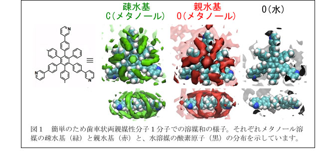 生体内では有機分子などが主に非共有結合で自己集合し、タンパク質、酵素、細胞や細胞膜などの機能を持った秩序構造を正確に形成することが知られています。生成物を間違えずに形成するためには、溶媒効果や置換基効果が重要であると言われていますが、その自己集合の「機構」は未だ充分に解明されていません。生体分子の自己集合の一つのモデルとして、近年、東京大学の平岡秀一教授らが実験的に見出した「歯車状両親媒性分子」の自己集合が注目を集めています。この分子は、溶媒条件や置換基条件の違いにより自己集合の有無が全く異なることも実験的に見出されています。この自己集合機構を分子論的に解明することにより、生体分子の秩序構造の形成の理解につながります。