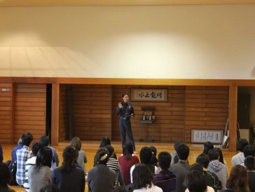 始めに、総合体育館第2体育室にて、六浦消防出張所長から火災発生時の避難方法や消火器、消火栓の取扱いについて説明を受けました。消火栓については体育室に設置されている実物を確認しながら説明していただいたので、実際の操作場面をイメージしながら聞くことができました。