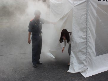 煙が充満したテントの中に入る「煙体験」では、高い位置に滞留する性質のある煙を避けるために、姿勢を低くしてテント内を通過していきました。火災発生時には煙に巻かれて亡くなる方が多いので、訓練で煙の流れを知っておくことは重要です。