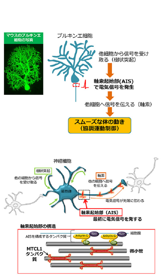 本研究によって、神経細胞が電気信号を発する構造であるAISが正常に形成されるためには、その内部にある微小管が密な束になる必要があることが明らかになりました。MTCL1遺伝子が変異したマウスが示す運動失調やプルキンエ細胞の変性は、ヒトの脊髄小脳変性症の症状に類似していることから、プルキンエ細胞でのMTCL1の更なる機能解析によって、脊髄小脳変性症の発症機構の解明、ひいては新たな治療法の開発につながることが期待されます。