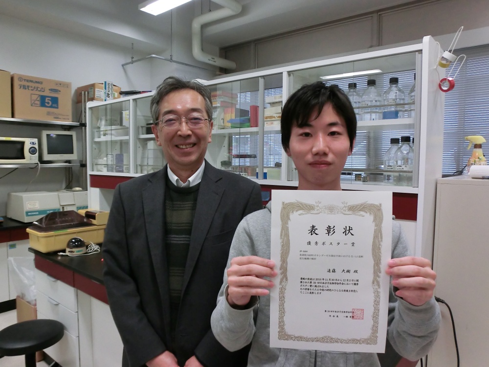 2016年11月30日(水)~12月2日(金)にパシフィコ横浜で開催された第39回日本分子生物学会で、荒谷康昭研究室(大学院生命ナノシステム科学研究科生命環境システム科学専攻)博士前期課程2年の遠藤大樹さんが優秀ポスター賞を受賞しました。