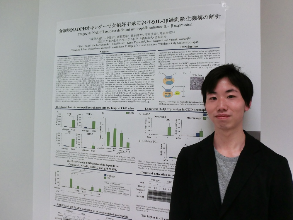 ところが、この酵素が欠損していると、大腸炎や関節炎など、感染とは無関係の炎症性疾患も発症しやすいと言われています。また、私たちの研究室では、この酵素が欠損しているマウス(CGDマウス)の肺に、死んだ病原菌を投与しただけでも、重篤な肺炎が起こることをすでに発表しています。私は、この酵素が欠損すると感染とは無関係に炎症が重篤化するメカニズムを明らかにすることを目的として研究を行ってきました。その結果、この酵素を欠損しているマウス(CGDマウス)の好中球は、IL-1βと呼ばれる炎症を酷くする物質を過剰に産生することを発見しました。そして、その過剰産生のメカニズムを詳しく解析して本学会で発表しました。この発見によって、CGDと呼ばれる疾患の発症メカニズムの一端を明らかにしたことが高く評価されて、今回の受賞につながったと考えています。