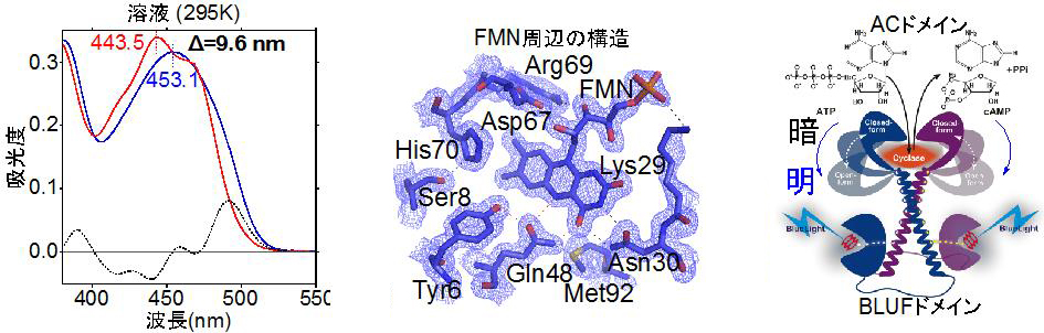 本研究では、OaPACの結晶を暗所で作製し、光活性化に伴う吸収スペクトルの変化を調べたところ、青色光受容体BLUFドメインの特徴である長波長シフト(445 nm)が観測されました(図左)。また、結晶中での光活性化スペクトルの酵素反応速度を測定し、青色光の20秒照射で活性化状態になることを初めて特定するとともに、光活性化時のOaPACの構造変化を明らかにしました。その構造変化は、まず光受容分子であるフラビン色素(FMN)が分子外側へシフトし(図中)、その周辺のアミノ酸Gln48の水素結合の変化によって、長く伸びたOaPACのα3ヘリックスが変化する、という形で伝わっていくことがわかりました。このことから、この長いα3ヘリックスはフラビン色素からシクラーゼの活性中心であるACドメインに至る光シグナルの伝搬路としての役割を担うことが分かりました。このように、OaPACの活性調節ではBLUFドメインの極めて小さな変化が活性中心の構造変化を誘導し、活性化ACドメインへ伝わって情報伝達物質cAMPを合成するメカニズムであることを解明しました(図右)。本研究の論文では、その分子メカニズムは青色光受容体BLUFドメインからcoiled-coil構造を呈する2本のα3へリックスが生みだすアロステリック効果でACドメインが開き、ドメイン間の連動により、cAMP生成が導かれることを提案しました。