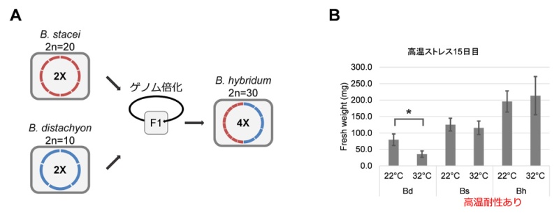 研究チームはまず、異質倍数体種B. hybridumとその祖先二倍体種であるB. distachyonとB. staceiの高温ストレス耐性を比較しました。その結果、B. hybridumとB. staceiのみが長期間の高温ストレスに対して耐性を示しました(図2)。