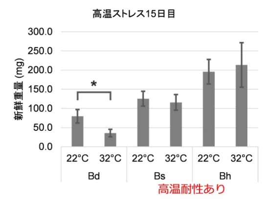 図2 ミナトカモジグサ種植物における高温耐性の違い 高温ストレスがミナトカモジグサ種植物に与える影響を示したグラフ。通常環境下(22℃)と高温ストレス環境下(32℃)で15日間育てたB. distachyon (Bd)、B. stacei (Bs)、 B. hybridum (Bh)のそれぞれの新鮮重量を測定した。各バーは12個体の平均値±標準偏差を表す。B. distachyonのみが、通常環境下で育てた場合に比べて、高温ストレス環境下で育てた植物の新鮮重量が有意に低下していた。