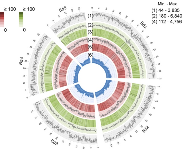 図3 ミナトカモジグサ種植物のゲノムの比較 B. hybridum、B. stacei、B. distachyonの三種のゲノムを比較することで検出したDNAの一塩基多型(SNP)の分布をB. distachyonのゲノムを構成する5本の染色体(Bd1~Bd5)上に示した図。5,720,539ヵ所の多型情報を得ることができた。 (1) 異質倍数体種であるB. hybridumのゲノムを構成するB. staceiとB. distachyonに由来するゲノムの間で検出されたSNPの分布。 (2) B. hybridumゲノムとB. distachyonゲノムの間で検出されたSNPの分布。 (3) DNA配列の一致性に基づいてB. distachyonゲノム上に位置づけたB. hybridumのDNA配列の分布。色が濃いほど位置づけられたDNA配列が多い。 (4) B. staceiゲノムとB. distachyonゲノムの間で検出されたSNPの分布。 (5) DNA配列の一致性に基づいてB. distachyonゲノム上に位置づけたB. staceiのDNA配列の分布。色が濃いほど位置づけられたDNA配列が多い。 (6) B. distachyon染色体上の遺伝子の密度。