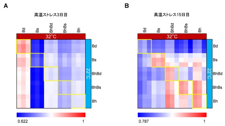 図5 高温ストレス環境下におけるミナトカモジグサ種植物のトランスクリプトーム 通常環境下(22℃)と高温ストレス環境下(32℃)で、3日間および15日間育てたときのB. distachyon (Bd)、 B. stacei (Bs)、 B. hybridum (Bh)の葉の遺伝子発現の様子を比較した。また、B. hybridumのゲノムを構成するB. distachyonゲノム上の遺伝子(BhBd)とB. staceiゲノム上の遺伝子(BhBs)の遺伝子発現の様子を比較した。赤いほど遺伝子発現の様式が類似しており、青いほど遺伝子発現の様式が異なっていることを表わす。黄色の線で囲んだ部分を見ると、高温耐性のあるB. hybridumおよびB. staceiは、高温ストレス3日目に遺伝子発現を大きく変化させたが、15日目には通常環境下で育った植物と類似した遺伝子発現になっていた。一方、高温耐性のないB. distachyonは、高温ストレス3日目では通常環境と類似した遺伝子発現を示したが、15日目に通常環境と比べ遺伝子発現の様子が大きく変化した。