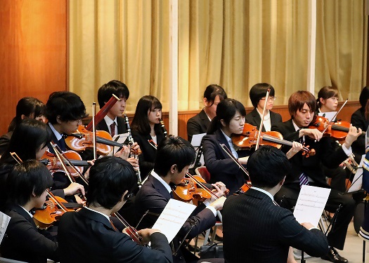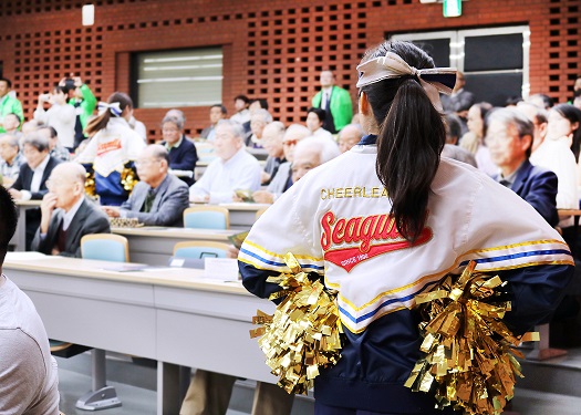 管弦楽団の部室から数十年ぶり!?に校歌の楽譜が発見されたことを記念して、応援団・チアリーダー部・管弦楽団の大編成で校歌の演奏・演舞を行いました。迫力満点の演舞とともに全員で校歌を大合唱。会場は一気に華やぎ、一体感に包まれました。