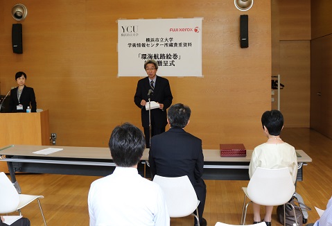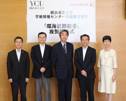 学術情報センターでは、富士ゼロックス株式会社が CSR 事業として行っている、「文化伝 承活動」の一環として、当館で所蔵している貴重資料「環海航路絵巻」の複製を制作してい ただきました。そして、平成 30 年6月 22 日(金)、金沢八景キャンパス市大交流プラザに おいて、完成した「環海航路絵巻」複製品の贈呈式を開催しました。