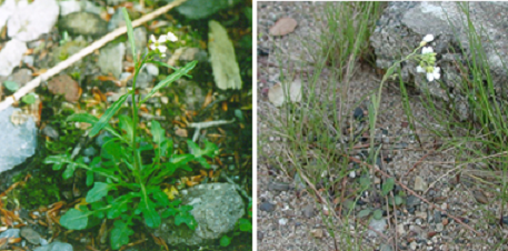 【図1】日本発の倍数体モデル植物ミヤマハタザオ。鳥取県大山の個体(左)と、低地型の亜種タチスズシロソウ(右、滋賀県琵琶湖岸)